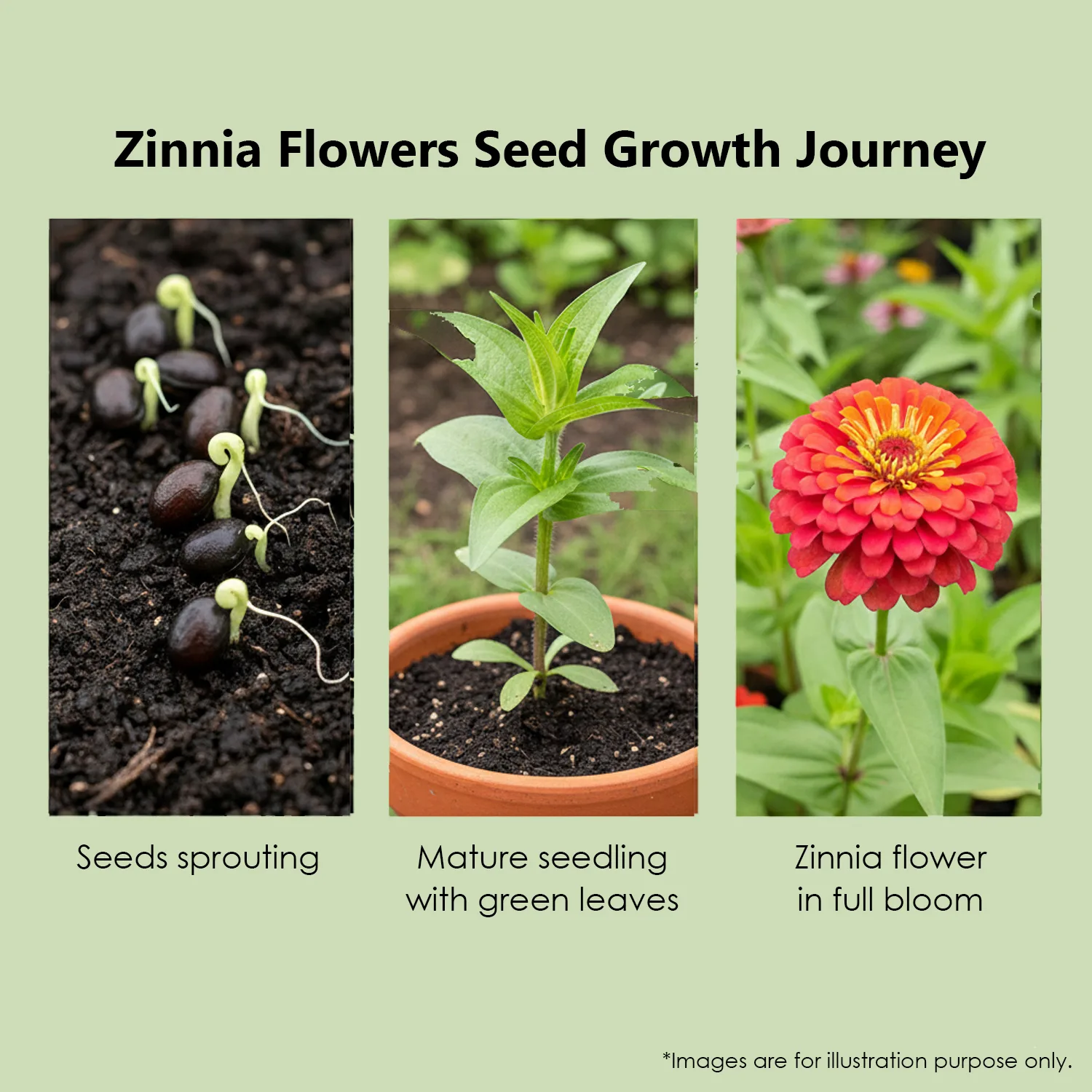 Germination typically in about 4–7 days (or slightly more) when conditions are good. Blooming from seed: depending on variety and conditions, blooms can appear perhaps 6-8 weeks after sowing. Zinnias generally bloom from mid‐summer until the first hard frost (since they are annuals).